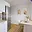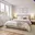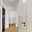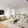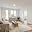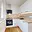 Bílá moderní kuchyňská linka je vybavena vestavěnými spotřebiči – elektrickou varnou deskou, elektrickou troubou, myčkou a digestoří. Je zde připraven prostor pro zapojení lednice a místo pod oknem je ideální pro kompaktní jídelní stůl, který dodá prostoru útulnou atmosféru.